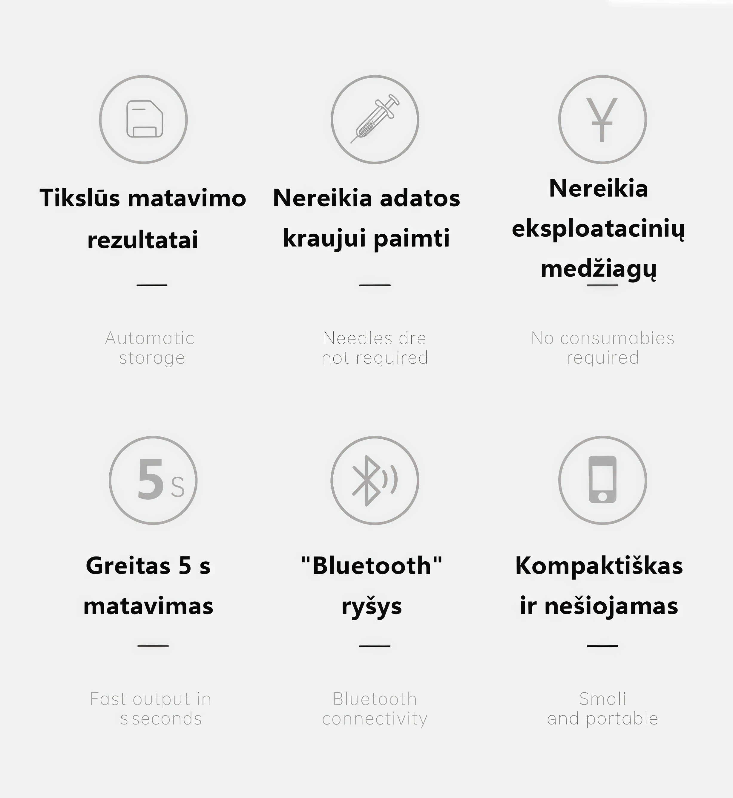 Neinvazinė technologija be dūrio – matuokite bet kur, bet kada ir neskausmingai.
