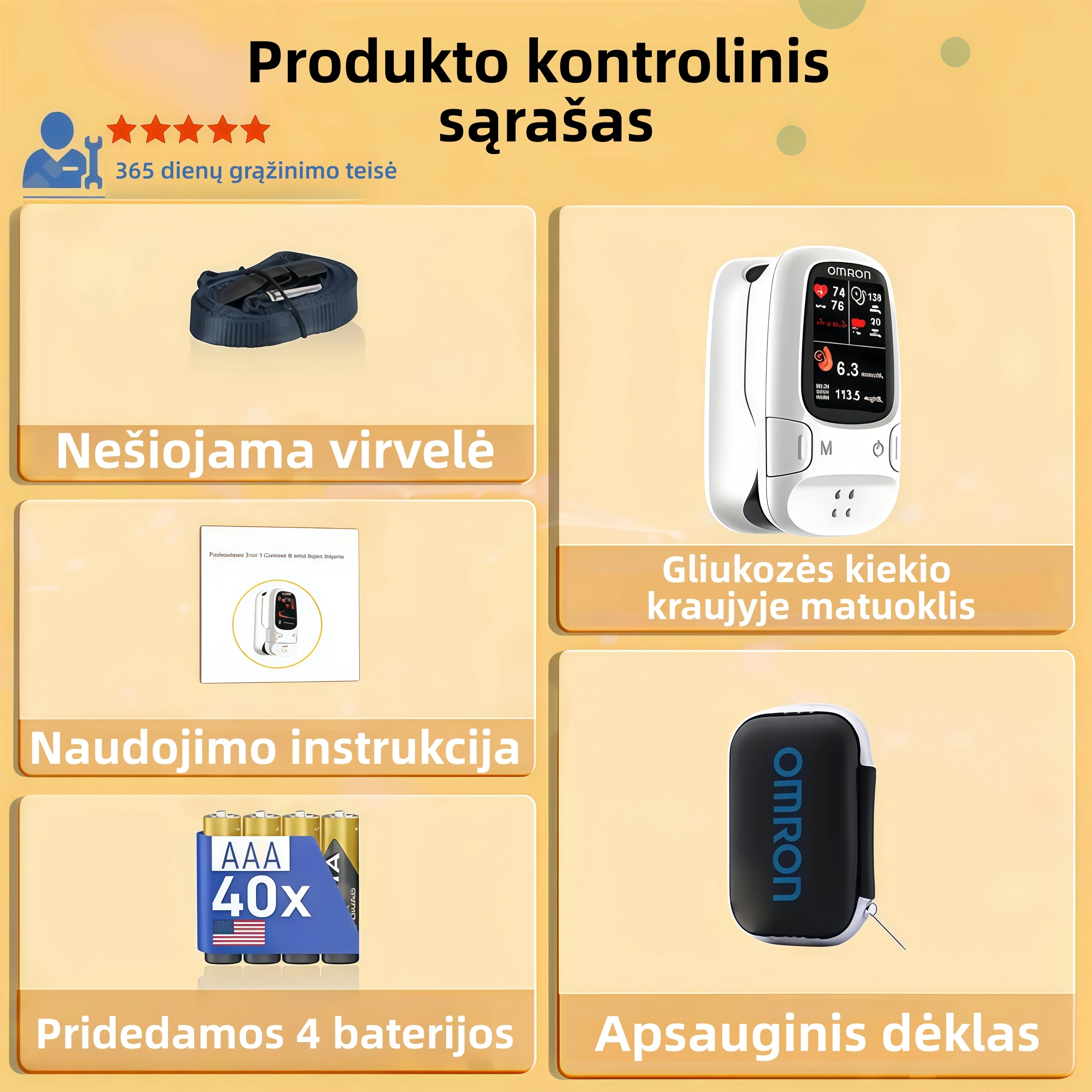 Visiškai neskausmingas – tiesiog uždėkite smilių ant „Omron™“ prietaiso ir per 5–8 sekundes bus rodomas jūsų cukraus kiekis kraujyje, deguonies įsotinimo lygis ir net širdies susitraukimų dažnis. Greita ir paprasta!
