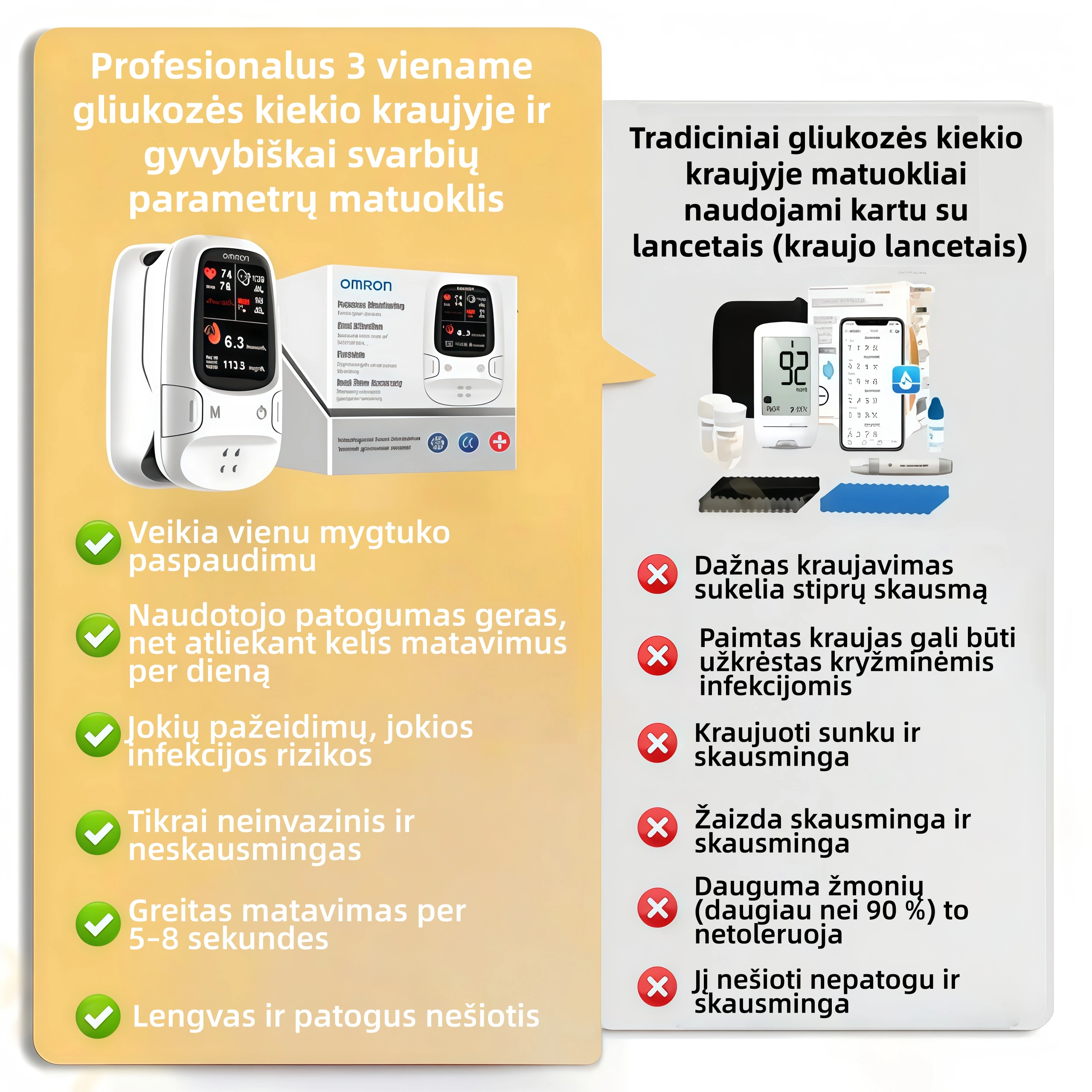 Dėl pažangios dirbtinio intelekto technologijos ir galingo lusto „Omron™“ yra tris kartus tikslesnis nei tradiciniai gliukozės kiekio kraujyje matuokliai, pateikiant patikimus ir tikslius rezultatus.